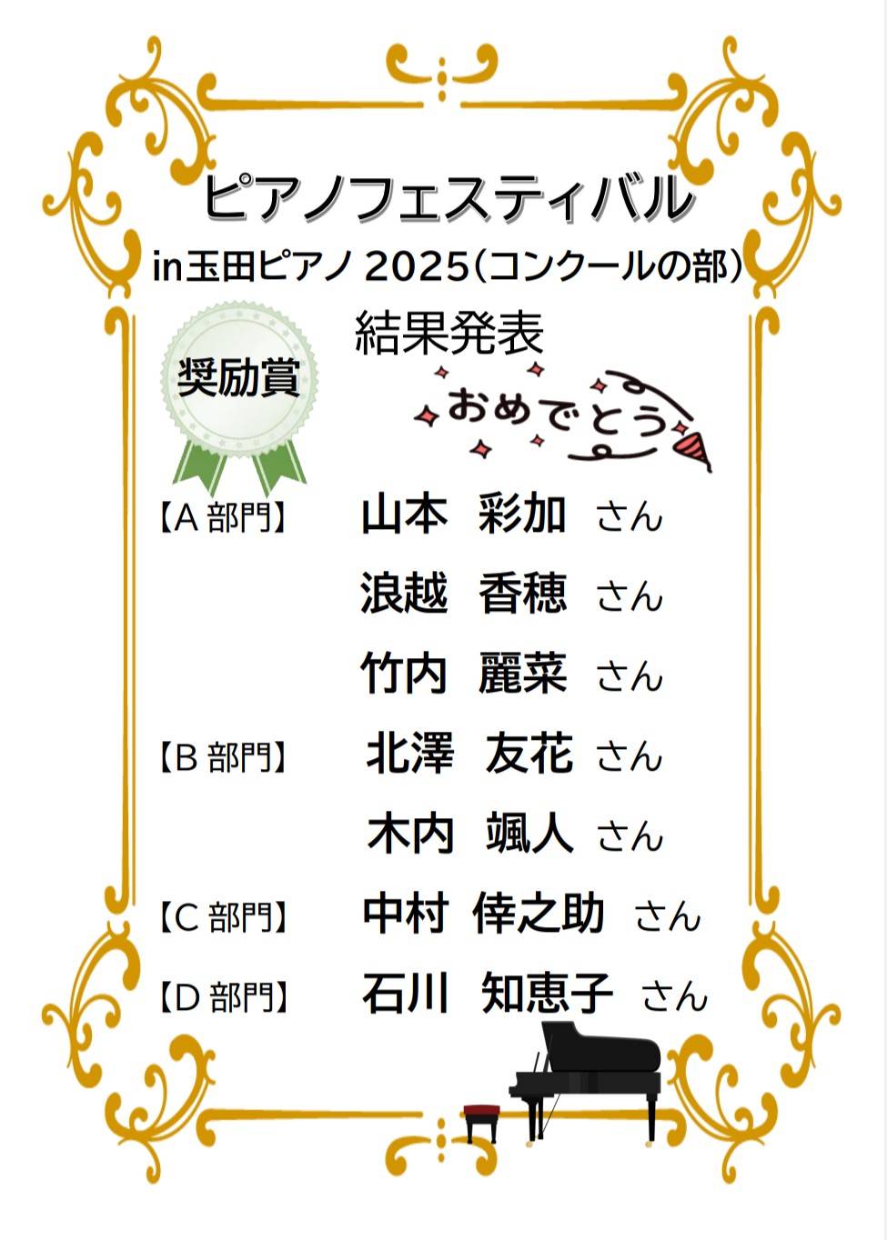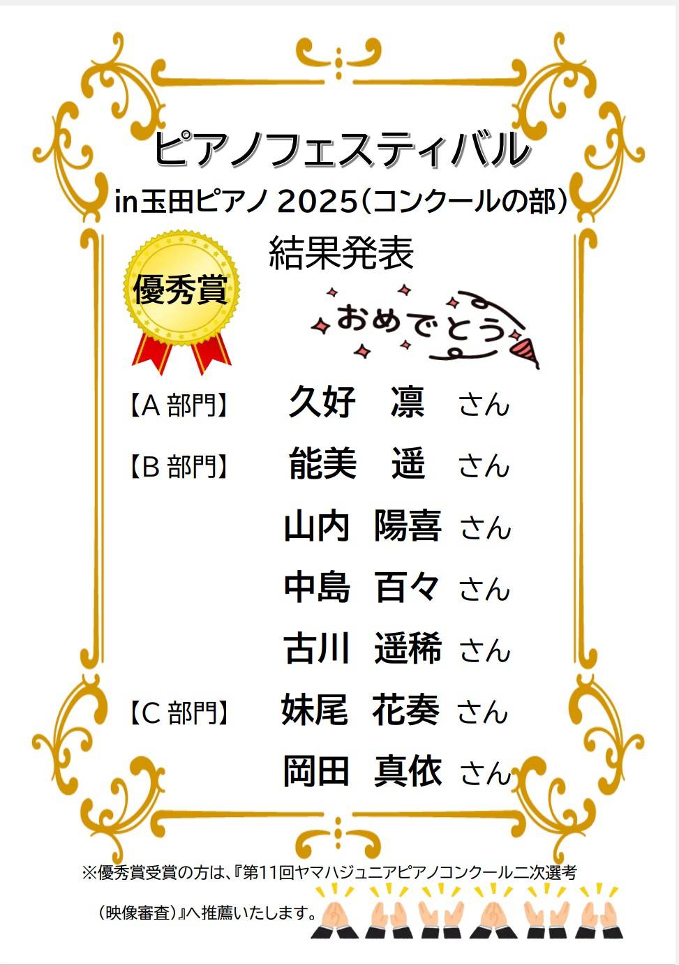 玉田ピアノ岡町/東豊中センター『ピアノフェスティバル㏌玉田ピアノ2025(コンクールの部)』が開催されました 2025年10月8日 10月5日(日) 吹田市文化会館メイシアター 小ホールにて、『ピアノフェスティバルin玉田ピアノ2025(コンクールの部)』を開催いたしました 岡町/東豊中センターからもたくさんの生徒さんが出場してくれました♪ 魅力ある演奏をありがとうございました♪ 受賞された皆さま、おめでとうございます✨️