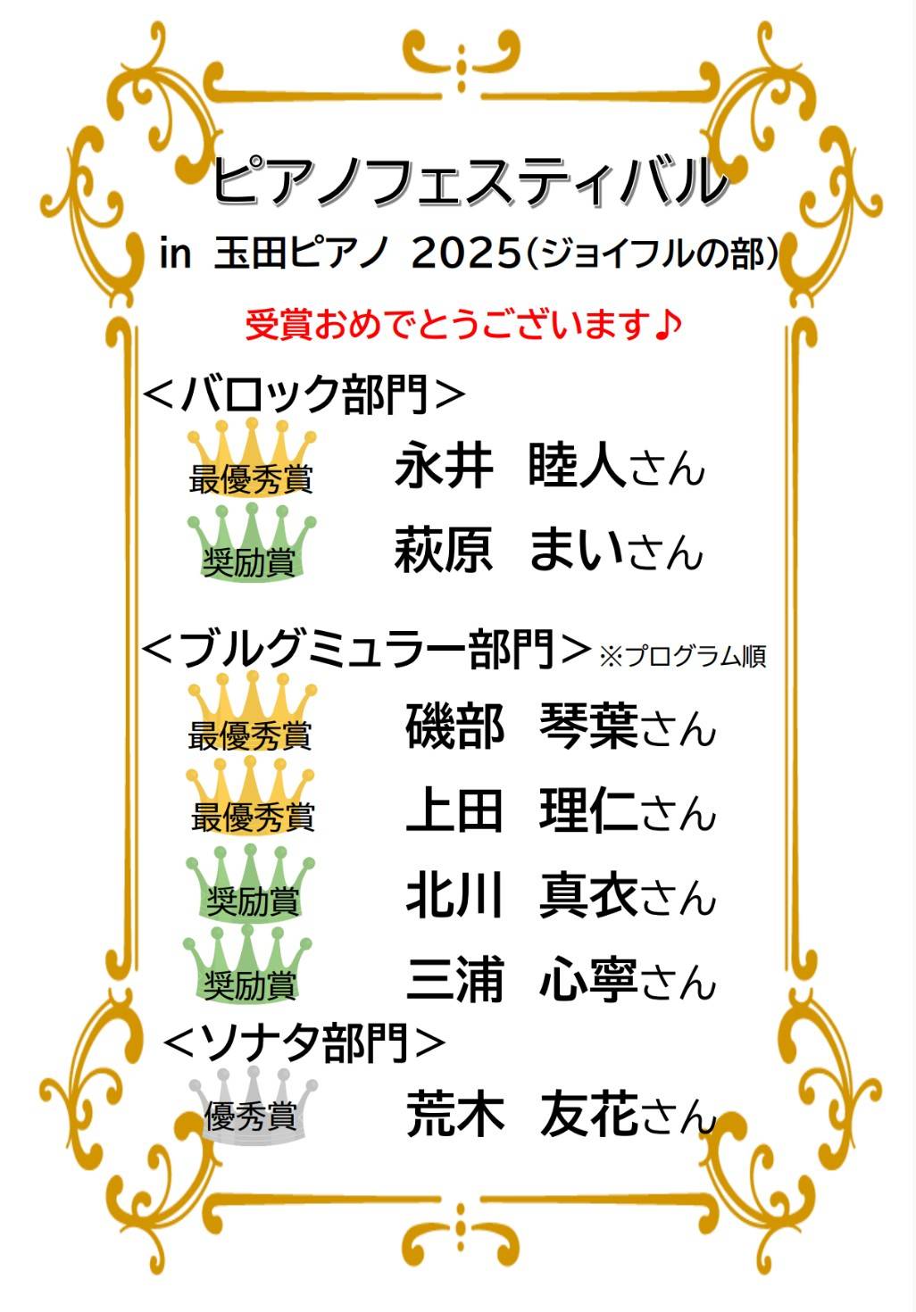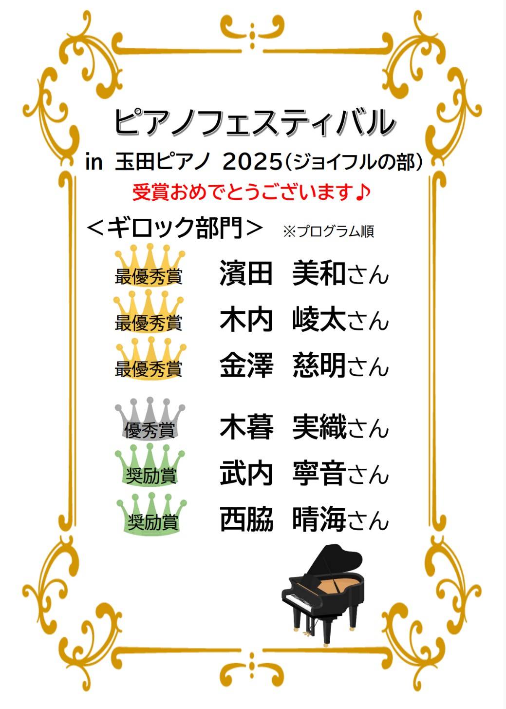 玉田ピアノ岡町/東豊中センター『ピアノフェスティバル㏌玉田ピアノ2025(ジョイフルの部)』が開催されました 2026年2月28日 2月22日(日)・23日(月・祝)豊中市立ローズ文化ホールにて、『ピアノフェスティバル㏌玉田ピアノ2025(ジョイフルの部)を開催いたしました。 岡町/東豊中センターからもたくさんの生徒さんが出場してくれました♪ 表現豊かな素敵な演奏をありがとうございました♪ 受賞された皆さま、おめでとうございます✨