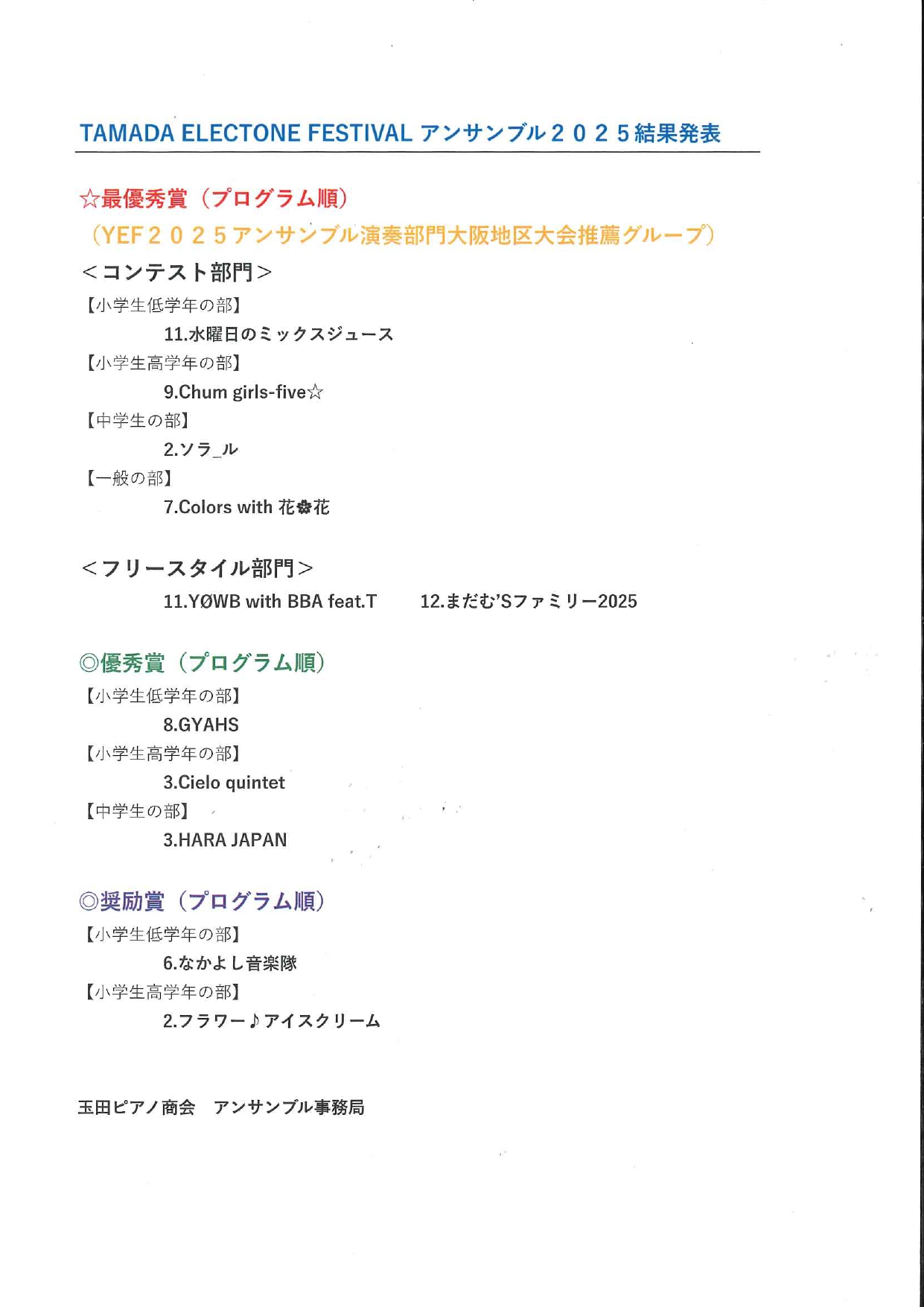 TAMADA ELECTONE FESTIVAL アンサンブル 2025 審査結果のお知らせ